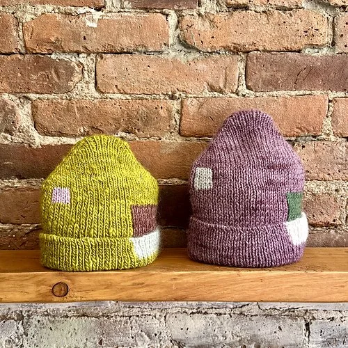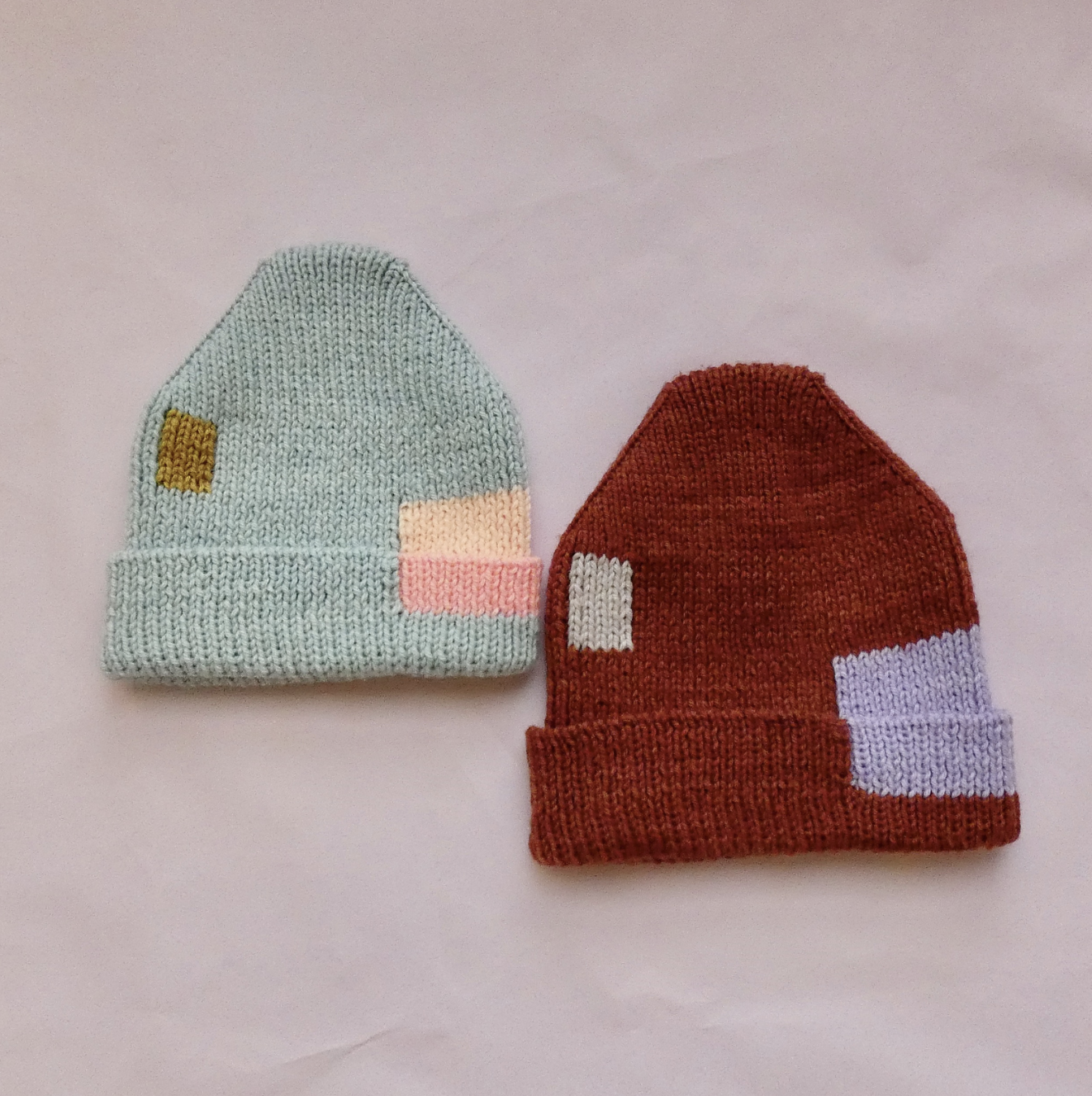 boxy fit garments + snug caps with asymmetrical color blocks. use your leftover yarn for intarsia to reduce waste (:
