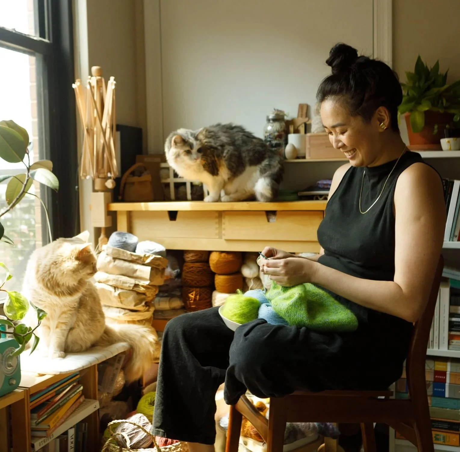 Knitting shares brainspace with stories from Asian diasporas, East Asian garment design, my training in art history, and the work of folks who play & slay with their fashion. I design with natural materials from people of color, womxn, queer maker communities.